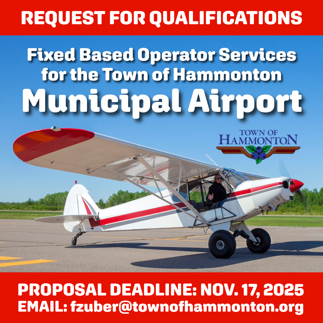 Request for Qualifications (RFQ): The Town of Hammonton is seeking a qualified Fixed Based Operator (FBO) for the provision of comprehensive aviation services at the Hammonton Municipal Airport (HWM) due by November 17, 2025 at 4:00 p.m.