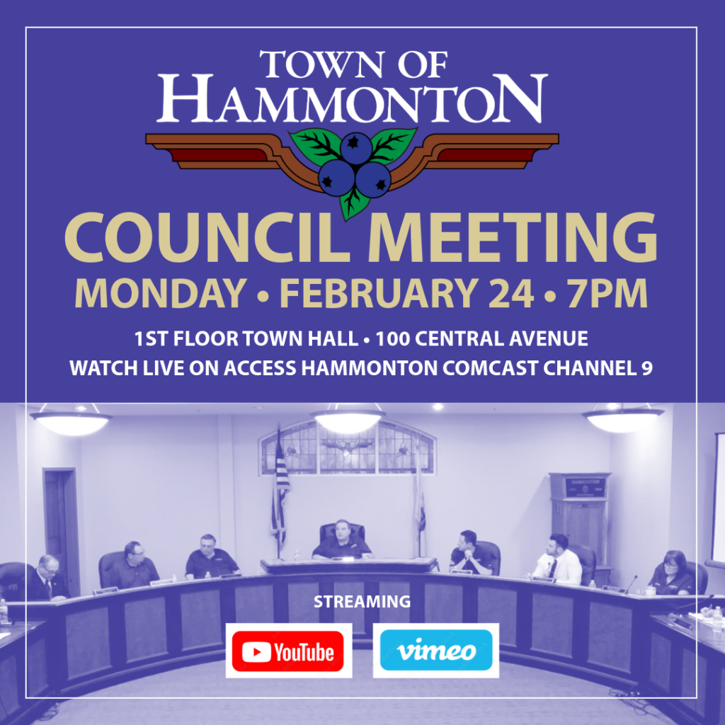 The Town Council meeting will be held on Monday, Feb. 24th, 2025 at 7:00 p.m. Watch live on Access Hammonton or your local Comcast channel 9. Links to our streaming channels and the meeting agenda are below.