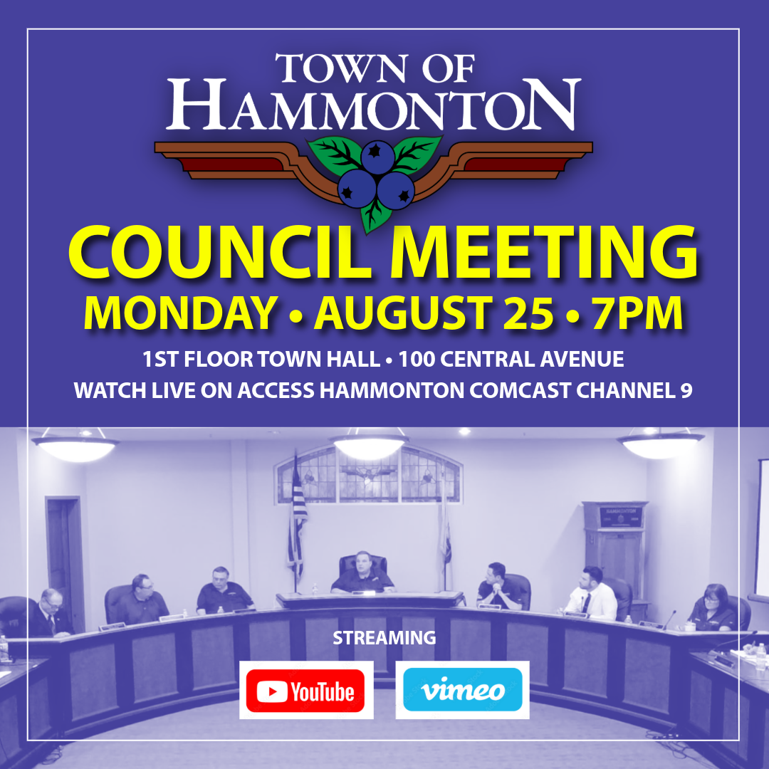 The Town Council meeting will be held on Monday, August 25th at 7:00 p.m. Watch live on Access Hammonton – Comcast channel 9. Links to our streaming channels and the meeting agenda are listed below.