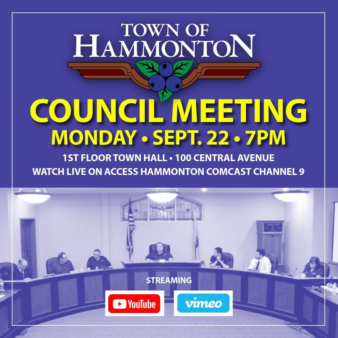 The Town Council meeting will be held on Monday, September 22nd, 2025 at 7:00 p.m. Watch live on Access Hammonton – Comcast channel 9. Links to our streaming channels and the meeting agenda are listed below.
