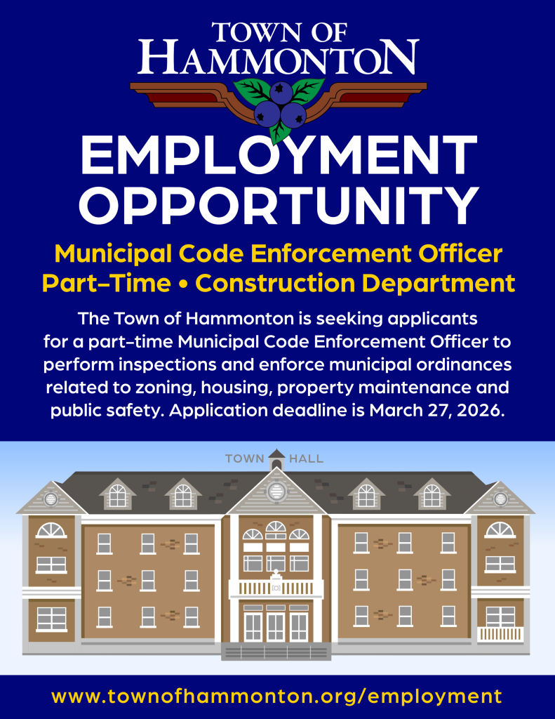 The Town of Hammonton is seeking applicants for a part-time Municipal Code Enforcement Officer to perform inspections and enforce municipal ordinances related to zoning, housing, property maintenance, and public safety. Duties include, but not limited to, conducting field inspections, investigating complaints, issuing violation notices and court summonses, preparing reports and case files, appearing in Municipal Court, and working collaboratively with other departments. Position requires regular public interaction and the ability to work independently in both the office and outdoor environments. Successful candidate will possess a High School Diploma or GED; valid NJ Driver’s License; strong verbal and written communication skills; proficiency with Word and Excel; be an excellent team player, organized and detail oriented. Bilingual in Spanish is a plus but not required. This position is 19.5 hours per week, $20.00 per hour.