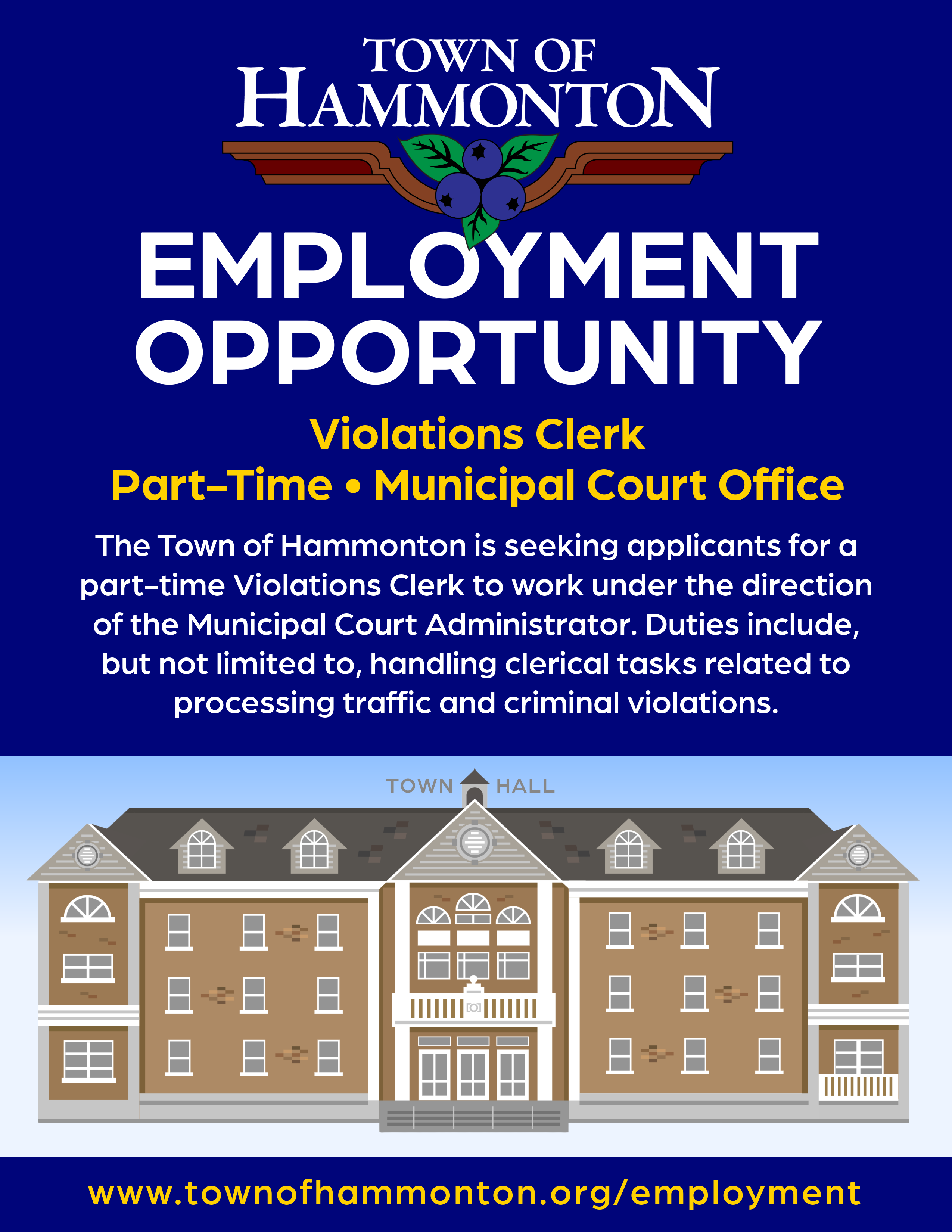 The Town of Hammonton is seeking applicants for a part-time Violations Clerk to work under the direction of the Municipal Court Administrator. Duties include, but not limited to, handling clerical tasks related to processing traffic and criminal violations, collecting payments, answering phone calls and walk-in inquiries and maintaining court records. Successful candidate will possess strong computer skills, be an excellent team player, organized and detail oriented. Bilingual in Spanish is a plus but not required. This position is 19.5 hours per week, $20.00 per hour.