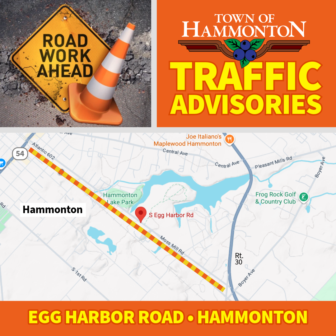 On MondayAugust 18, a single lane, alternating traffic pattern will be in effect along Egg Harbor Road in Hammonton between Route 54 and Route 30.