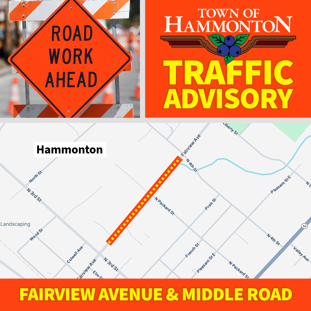 Traffic Advisory: Milling and paving operations are scheduled to occur on Fairview Avenue and Middle Road in Hammonton from Tuesday, November 3rd, through Friday, November 7th. Work will take place from 7 a.m. to 5:30 p.m., each day, weather permitting. Motorists should expect delays and seek alternate routes, especially during peak travel times. Please exercise caution when in the area. Your patience during this inconvenience is greatly appreciated. Thank you.