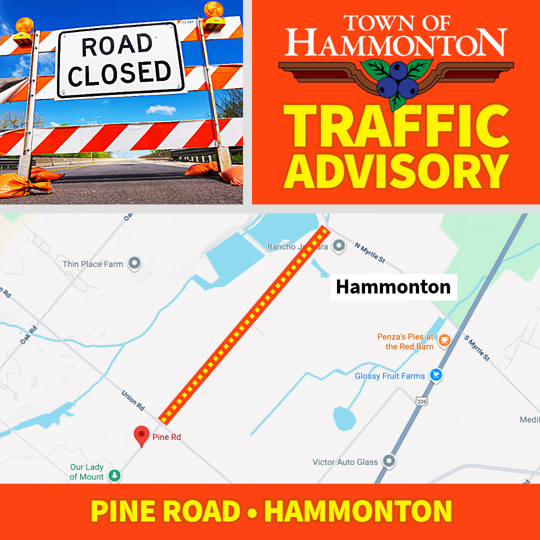 Pine Road in Hammonton is closed between Union Road and Myrtle Street today, Monday, September 22, 2025, from 8 a.m. to 1 p.m. due to a local municipality water main repair. Motorists should follow the posted detour and plan travel time accordingly or seek an alternate route.